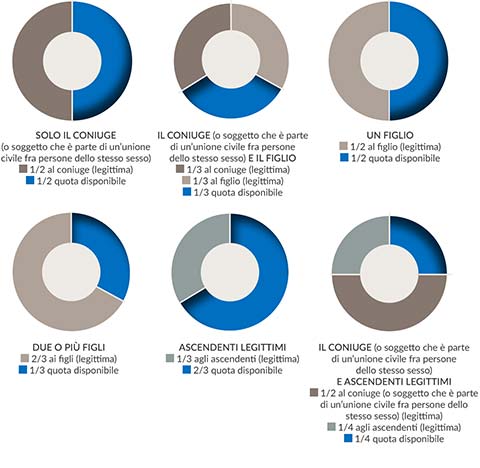 - Si intende per quota legittima la parte dell’eredità riservata per legge ai soggetti legittimari: coniuge o soggetto che è parte di un’unione civile fra persone dello stesso sesso, discendenti, ascendenti, collaterali, altri parenti.